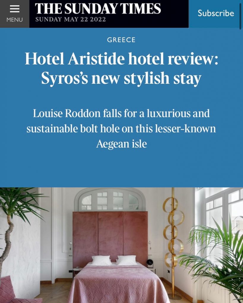 Το Aristide Hotel & Restaurant πρωταγωνιστεί στους Sunday Times και η βραβευμένη travel writer Louise Roddon προτείνει το υπέροχο νησί μας στους αναγνώστες της βρετανικής εφημερίδας
